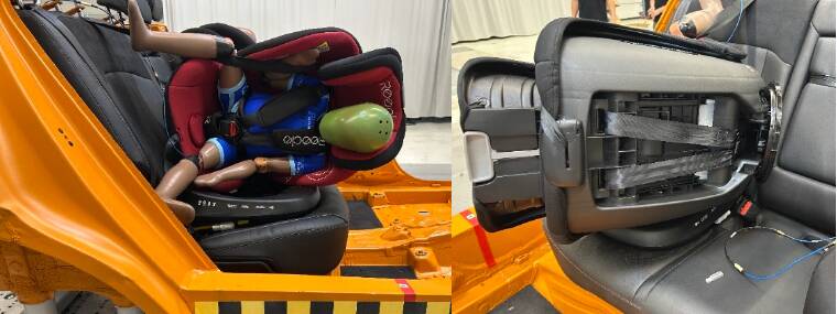 Pentru crash‑test, scaunele sunt montate într‑o caroserie reală (în prezent un SUV de clasă compactă) fixată pe un sled de test. Se simulează atât impact frontal, cât și impact lateral, cu manechine instrumentate de diferite dimensiuni, în funcție de grupa de vârstă pentru care este destinat scaunul.