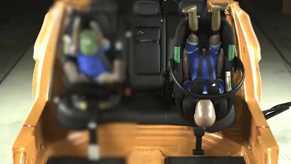 A fost „catapultată” prin interiorul mașinii, ceea ce în viața reală înseamnă un risc major de rănire severă sau fatală a copilului.